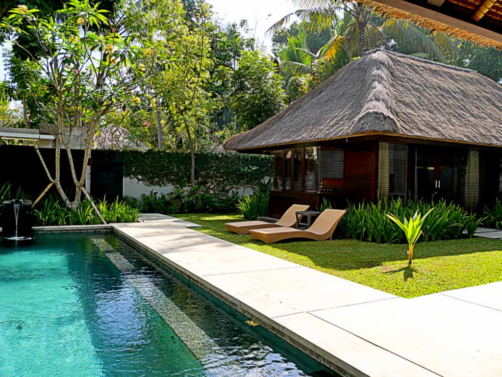 The private swimming pool is full-sized, has a water feature and is surrounded by lush vegetation and flowers. I couldn’t wait to take a dip! There are also comfy sunbeds by the side so you can top up your tan.