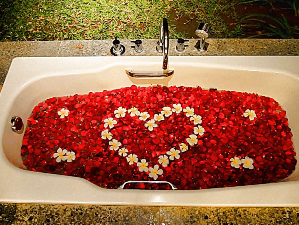 Both of the bedrooms have open-air bathrooms, and the master bathroom has somewhat of a spa atmosphere…especially with the little surprise that the staff had in store for us! I felt like I was in the rose petal scene from American Beauty.