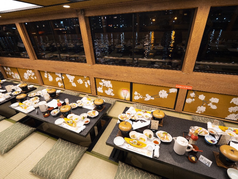These days, the river cruise includes a full banquet, free-flowing alcohol or soft drinks and live entertainment. The traditional Japanese seating is comfortable as there is a hollowed out section where you place your legs.